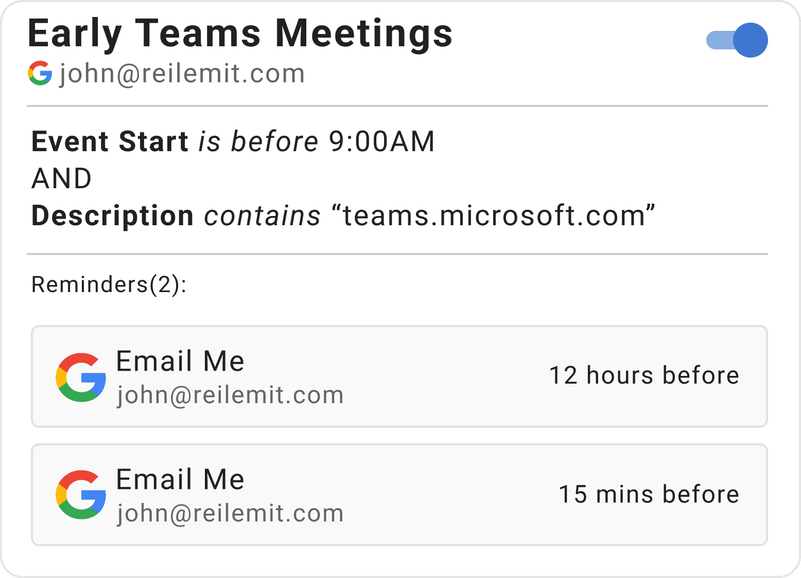 John needs extra help remembering when he has early Teams meetings. This rule monitors the [email protected] Google calendar for events that start before 9AM and that have a Teams meeting link in the event details.